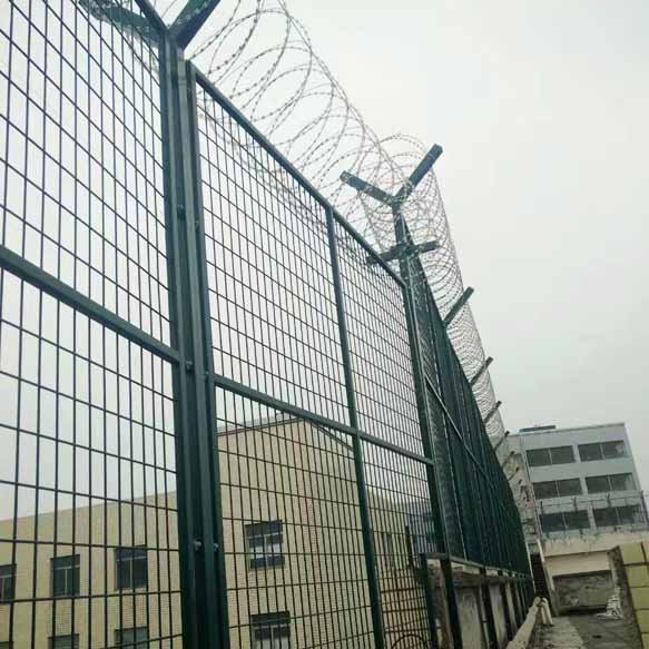 監獄護欄網又稱作“Y型安全防御護網”監獄鋼網墻,是由V型支架立柱,加強型焊接片網,安全防盜連接件和熱鍍鋅刀片刺籠組成強度和安全防御性級別很高,近年來,被廣泛應用在監獄,機場,軍事基地等高安全場所。