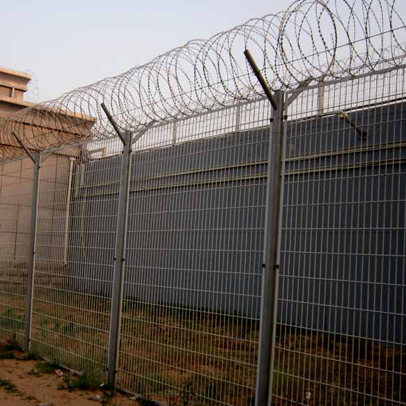 監(jiān)獄鋼網(wǎng)墻又稱作"Y型安全防御護網(wǎng)",是由V型支架立柱加強型焊接片網(wǎng),安全防盜連接件和熱鍍鋅刀片刺網(wǎng)組成強度和安全防御性級別很