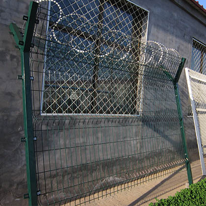 監(jiān)獄監(jiān)管區(qū)隔離網(wǎng) 監(jiān)獄通透式鋼網(wǎng)墻又稱作“Y型安全防御護網(wǎng)”,該產(chǎn)品主要采用高強度鋼絲網(wǎng)片與蛇覆式刀片刺網(wǎng)和防盜連接件組合而