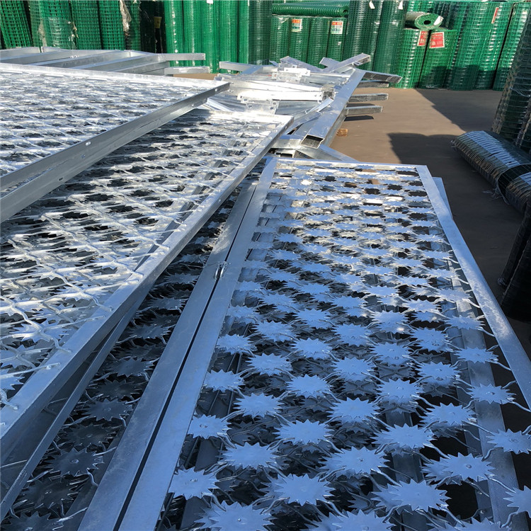 監獄梅花刺隔離網-監獄太陽花刺網單網幅度為3000mm*4500mm,使用邊框為50*50*5mm角鋼和40*3mm扁鐵,將網絲、角鋼、扁鐵焊為一體;邊框與立柱采用螺栓固定邊耳式連接,邊耳均為60*60*6mm扁鐵,邊耳螺孔可調,調節距離不小于20mm;邊耳固定螺栓為直徑14mm*50mm全絲熱鍍鋅安全螺栓、螺母,每片網單邊連接點為8個以上。