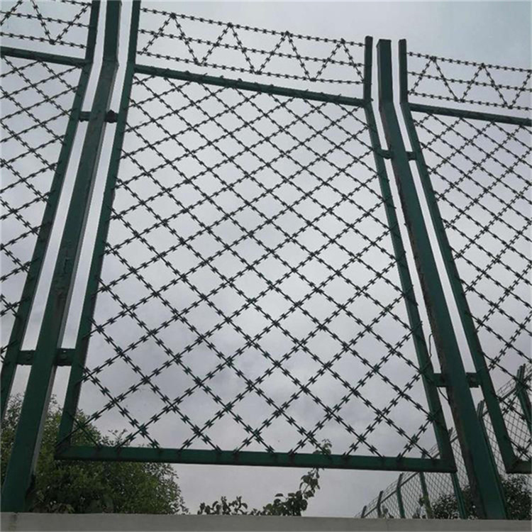 5. 監獄鋼網墻頂部防攀爬刀片滾網、拉絲、卡扣,均采用不銹鋼材質。刀刺網安裝固定卡扣整體調正,使刀刺網不出現擰轉情況,刀刺刺圈分布均勻,每隔30-40cm與拉絲固定;段連接處需將兩端刀刺網做連接固定,刀刺網固定點需緊鎖不得出現松動、脫落現象;刀刺網安裝與隔離網平行,上下左右均成直線延伸,轉角處需做加密加固處理。