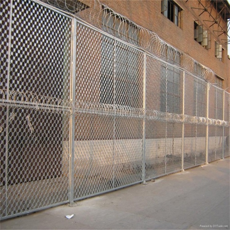 監獄安防網又稱監獄護欄網或監獄隔離柵, 它主要是采用高強度的刀片剌網與普通防護網的結合,由V型支架立拄,加強型焊接片網,安全防盜連接件和刀片刺網組成。刀片剌網是一種新型防護網,由銳利尖角鍍鋅鋼板或不銹鋼薄板做刀片,鋼絲做芯線組合而成的防護器材。