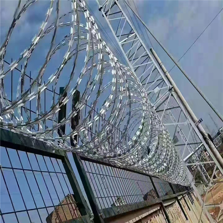 2.包絲 由熱鍍鋅鋼板或者不銹鋼板沖壓的刀片狀板條,包裹高張力鍍鋅鋼絲或者不銹鋼絲,形成半成品刀片刺繩。