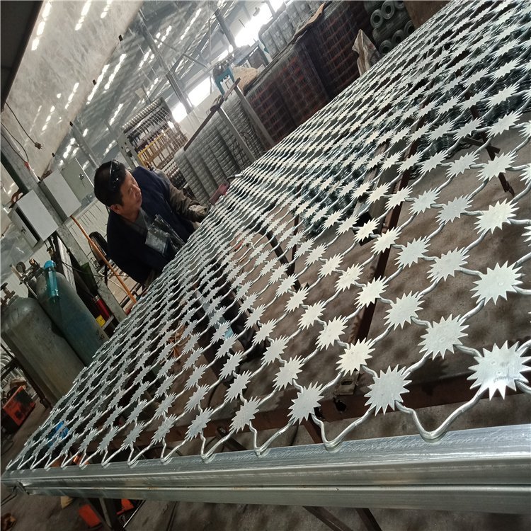 蛇腹型刀刺網(wǎng)安裝在隔離網(wǎng)內(nèi)側(cè),與柱頂平齊,固定卡扣整體調(diào)正,使刀刺網(wǎng)不出現(xiàn)擰轉(zhuǎn)情況,刀刺圈分布均勻,距離≤375px;分段連接處需將兩端刀刺網(wǎng)做連接固定,刀刺網(wǎng)固定點(diǎn)需緊鎖,不得出現(xiàn)松動(dòng)、脫落現(xiàn)象;上下左右均成直線延伸,轉(zhuǎn)角處需做加密加固處理。