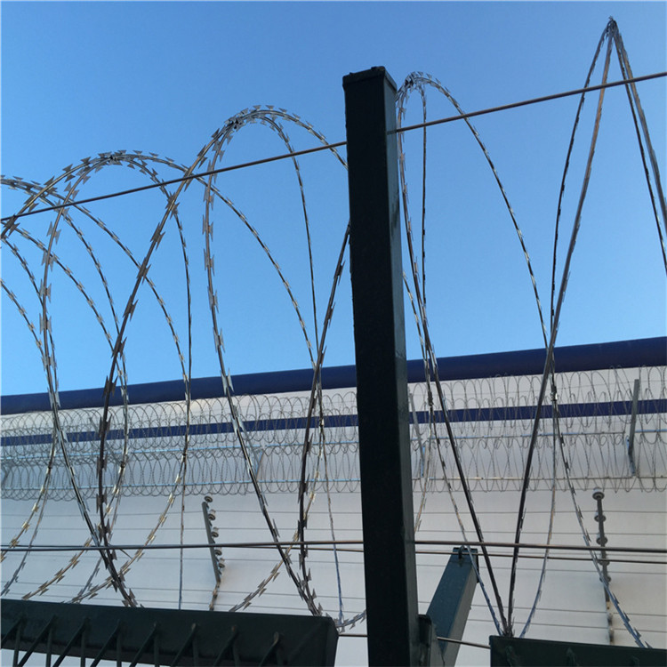 螺旋型刀片刺絲, 螺旋單一型刀片刺網是由一根蛇腹型刀片刺繩環繞而成,不需要使用卡子來固定,按照其展開的自然形式進行安裝。是刀片刺繩布置的一種,它沿墻壁或柵欄自然環繞來達到防護目的。單螺旋刀片刺繩一般使用的刀型是CBT-60和CBT65。材質:優質低碳鋼絲, 鍍鋅、涂塑、噴塑 。特點:網身剛硬,可以安裝傳感裝置等、不必用張力絲、不需要高技術工人維護、易安裝、維護成本低。