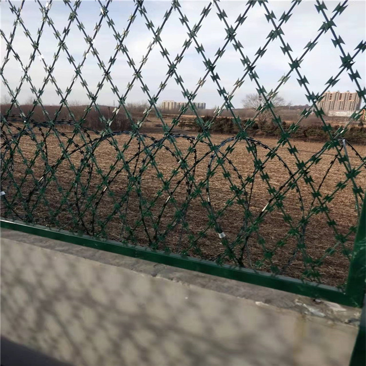 蛇腹式刀刺網材料有中碳鋼絲、冷軋鍍鋅薄板,不銹鋼板,不銹鋼絲。蛇腹型刀片刺網,上、下部懸掛0.5米的交叉蛇腹型刀片刺網,刀片刺網采用鋼板沖壓成型包附于鋼絲(筋絲)之上,由銳利尖角鍍鋅鋼板或不銹鋼薄板做刀片,高張力鋼絲做芯線組合而成的。鋒利的刀型刺由雙線扣裝后成蛇腹狀,既美觀又讓人不寒而粟。起到了很好的阻嚇作用。刀片刺網硬度好,
