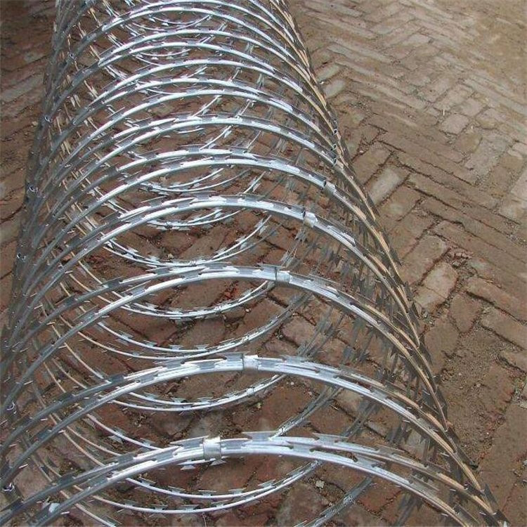 螺旋圈狀刀刺網主要利用其獨特的形狀和材料特性來阻止罪犯的入侵和逃脫。這種刀刺網通常由高強度材料制成,如不銹鋼、高強度聚合物等,具有極高的抗拉性能和刀片般的銳利邊緣。當罪犯接觸到刀刺網時,其銳利的邊緣會對其造成嚴重的切割傷害,使得罪犯不敢輕易攀爬或穿透