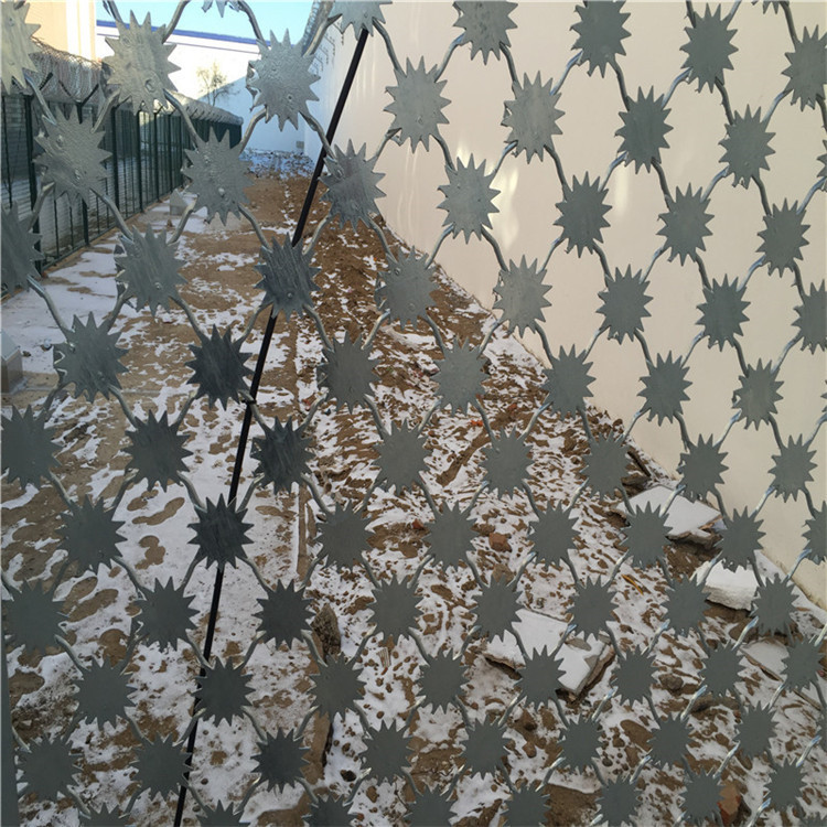 1、梅花刺片:梅花刺片直徑不小于7.5cm(直徑6cm、7cm、8cm),刺片厚1.5mm,采用Q235低碳鋼板沖壓成型。梅花刺片用氬弧焊將梅花形刺片焊接在美格網的節點上,形成刺形保護,有效的防止了手握腳攀。
