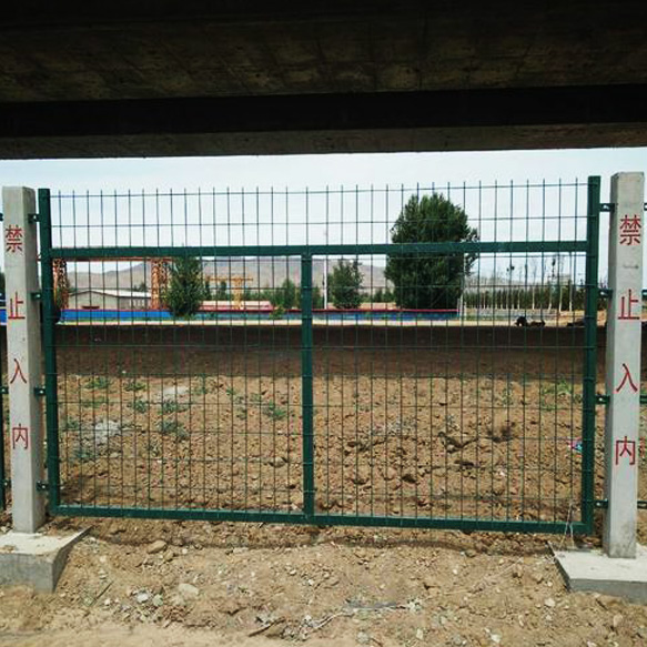 鋼筋混凝土立柱金屬網片防護柵欄可采用單開門或雙開門兩種形式。單開寬度1.5m,雙開寬度3m,其網片形式與防護柵欄保持一致,并通過銷鈾、銷鈾套與立柱連接。