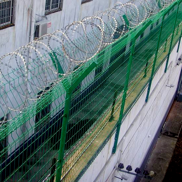 獄墻鋼網墻-通道隔離網具有結構新穎、堅固緊密、網面平整、網孔均勻、刀鋒銳利、防攀爬、抗腐蝕性強等特點。建設于監獄的內外墻地面及高墻之上,形成一道高不可攀、難以逾越的隔離障礙。具有嚇阻、防翻越等效果,材質堅硬,高強度,高張力,造型設計獨特,不宜觸摸,因而能達到極好的防護隔離效果。