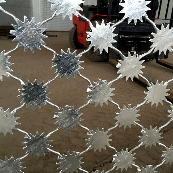 2、網(wǎng)片為菱形網(wǎng)孔,網(wǎng)格尺寸∶120mm*110mm(高*寬),網(wǎng)絲直徑8mm,采用S195線材高壓焊接,每一個焊點附焊梅花刺一個。