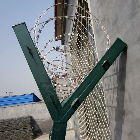 4、在防攀爬刀刺網(wǎng)的Y字型支架的兩邊各拉一根鋼絲,對刺網(wǎng)進行再固定,以免左搖右晃。