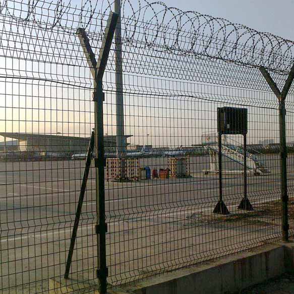 機場圍網具有安全性高、防攀爬能力好,網片連接方法選用特制SBS緊扣件,有效避免人為的破壞性拆卸,橫向四道折彎加強