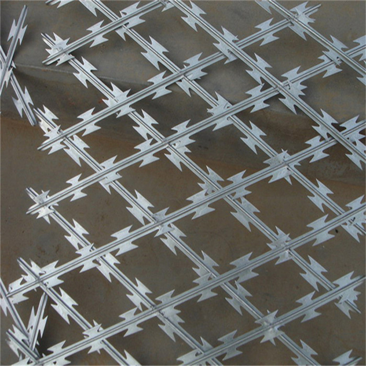 焊接刀片防護網產品介紹熱鍍鋅鋼板或不銹鋼薄板沖壓出尖銳的刀片狀,高張力鍍鋅鋼絲或者不銹鋼絲做芯線組合而成的阻絕器材。由于刺網造形獨特不易觸摸,因而能達到很好的防護隔離效果。產品的主要材質有鍍鋅板和不銹鋼。
