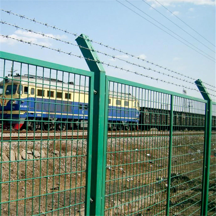 高速鐵路防護柵欄類型區(qū)分與作用說明:雙邊絲護欄,直框護欄,頂部30°折彎的護欄。一般鐵路線路兩側為了阻止落石或者阻擋外界的任何動物的時候會選擇雙邊絲護欄網作為隔離網。鐵路鐵軌兩側會使用直框護欄或者加折彎的護欄作為防護網。但是作為鐵路防護柵欄的護欄邊框不能使用普通的20*30的小邊框,而是采購30*40的方管邊框作為護欄網的邊框與低碳鋼絲焊接?;蛘呤且凿摪寰W作為網片,四周焊接角鐵,也被稱為框架型的鐵路防護柵欄。安裝尺寸:1.8米*3米,柱中到柱中,鐵路線路上常采用水泥立柱與網片連接。邊框:30*40mm,或者40*40的角鐵。表面處理:浸塑草綠色或者浸塑墨綠色。